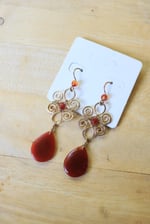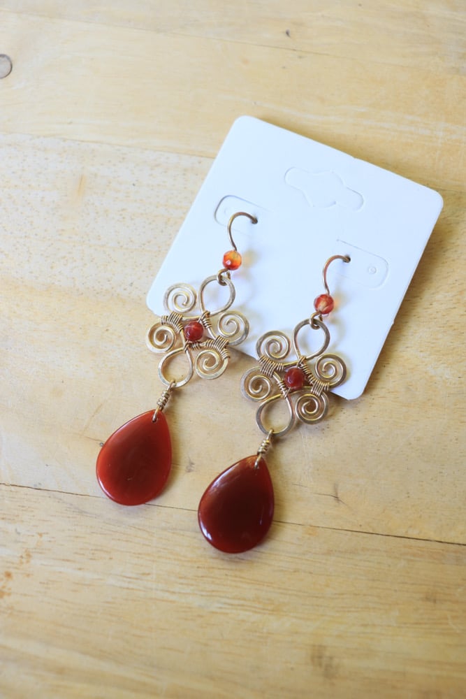These are entirely handmade and hand woven brass earrings, made by creating and hammering two frames and weaving them together. I wove a carnelian crystal bead in the center of the frame, dangled a carnelian teardrop from the bottom of the earring, and then added a final carnelian into the earring hook! The red theme here was inspired by the fall colors of the changing leaves in Colorado🍂☀️🌞