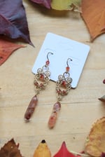 These earrings are made entirely by hand, shaping and bending each frame, hammering them flat, and weaving them together using a very thin gauge wire. In the center of the main frame I wove in a carnelian bead, as well as in the earring hook. Near the bottom of the frame I wove in two faceted red garnet beads, and lastly dangled a fire quartz tower bead from the bottom of the frame. The red tones in this earring were inspired by the fall changing leaves.