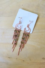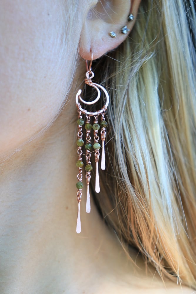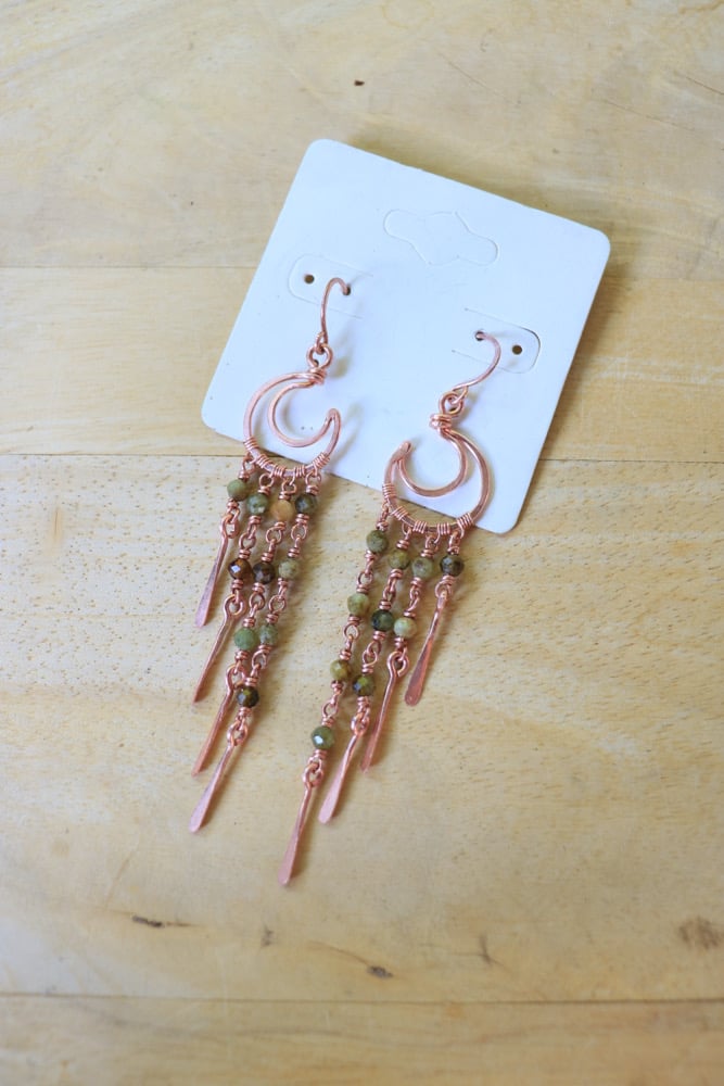 These are entirely handmade copper earrings, made by making the main moon frame, hammering it flat, and attaching green garnet strung beads to dangle from the moon in a cascading pattern. From the beads dangle hammered fringes that have been filed smooth, and create a wind chime sound when they hit against one another! The green garnet here was used as inspiration from the Colorado fall leaves 🍁