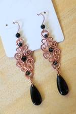 These are entirely handmade and hand woven copper earrings, made by creating and hammering two frames and weaving them together. I wove in various sizes of black Onyx crystals within the frame, dangled a Onyx teardrop from the bottom, and then added a final Onyx into the earring hook! The black theme here was inspired by the Halloween / October spooky season 👻🎃