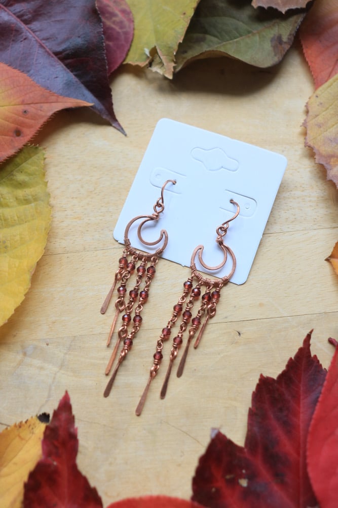These are entirely handmade copper wire earrings, made by making the main moon frame, hammering it flat, and attaching red garnet strung beads to dangle from the moon in a cascading pattern. From the beads dangle hammered fringes that have been filed smooth, and create a wind chime sound when they hit against one another! The red crystal choice here was used as inspiration from the fall season 🍁