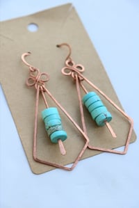 These are hammered copper wire earrings, made with Howlite crystal beads attached to a hammered piece of copper, dangling in the center.