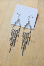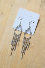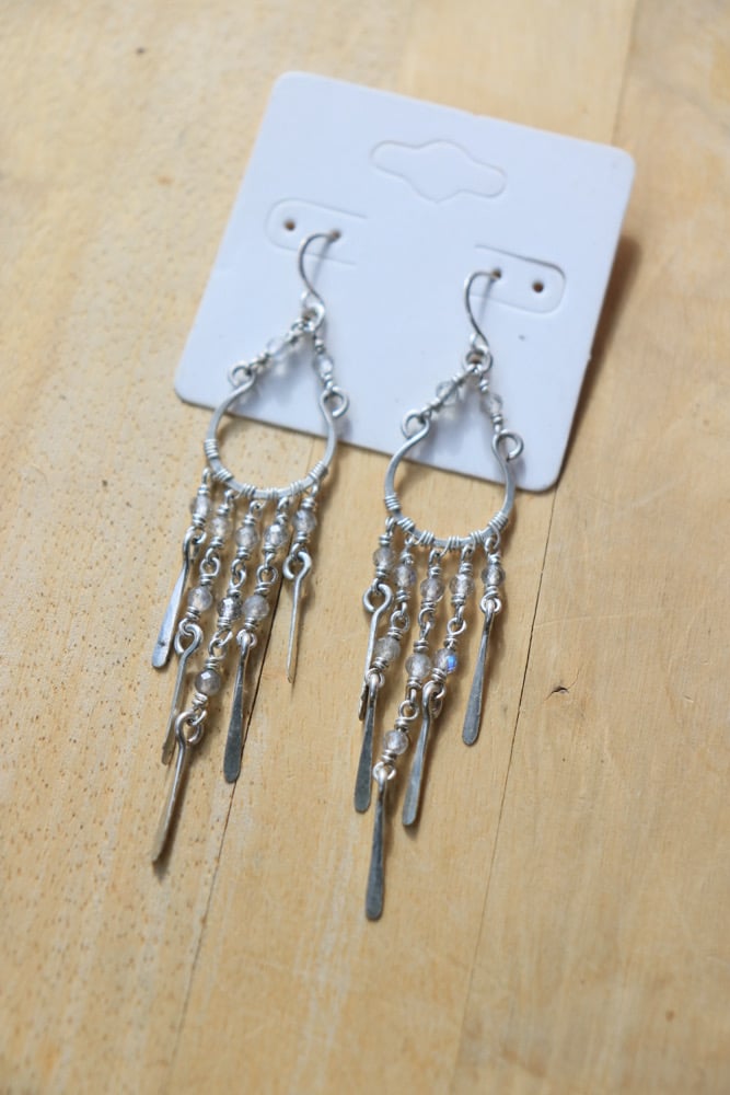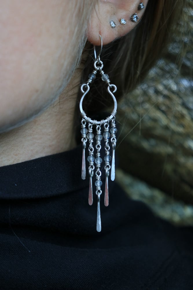 These are fully handmade sterling silver earrings, made by creating a central open hoop frame, stringing each individual bead together, and then cutting and hammering each individual fringe and attaching it onto the dangling beads. for these earrings, I used labradorite crystal beads. It’s always hard to capture the chandeliers laying flat, so I hope you get a better visual of me wearing them :)