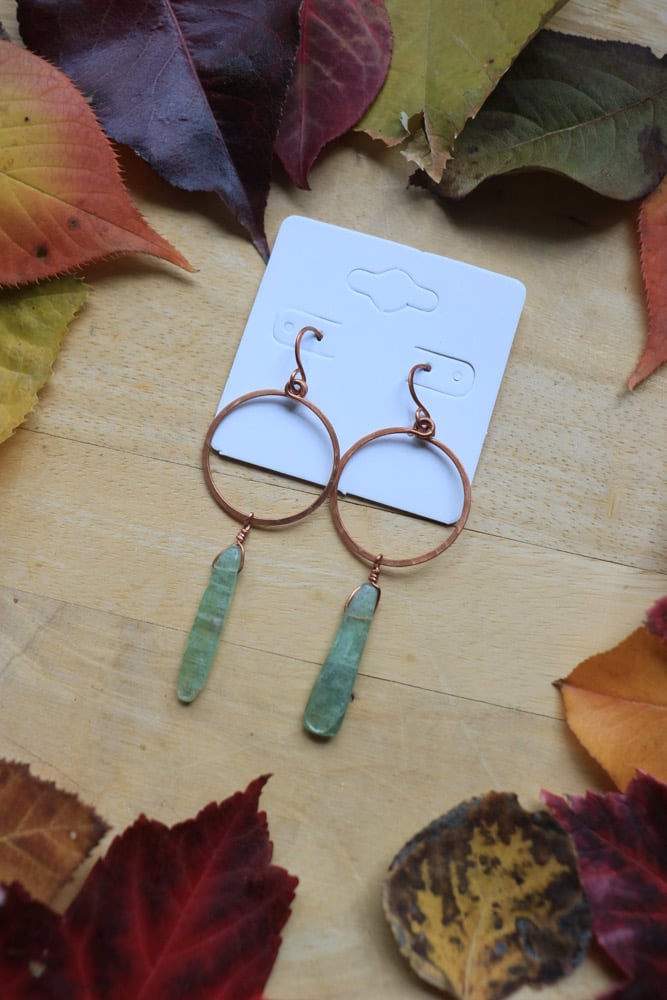 These are fully hand bent and shaped copper hoop earrings that have been hammered flat, and have a natural green kyanite crystal bead dangling from the hoop. Please note that both of the kyanites are “irregular” and I tried picking the two that were most alike, though they are not identical