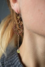 These earrings are a combination of brass and copper wire used together— copper wire used in the main open hoop frame, brass wire used in the middle of the hoop frame as well as in the top frame above that connects to the main frame, and lastly in the earring hook. These earrings are made entirely by hand, creating each frame, jump ring, and earring hook in itself. I decided to use green garnet with the two metals as the overall color palette was inspired by the fall season with warm tones.