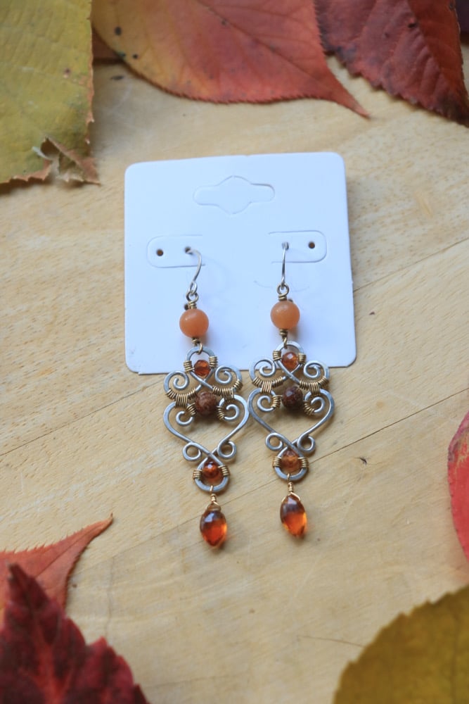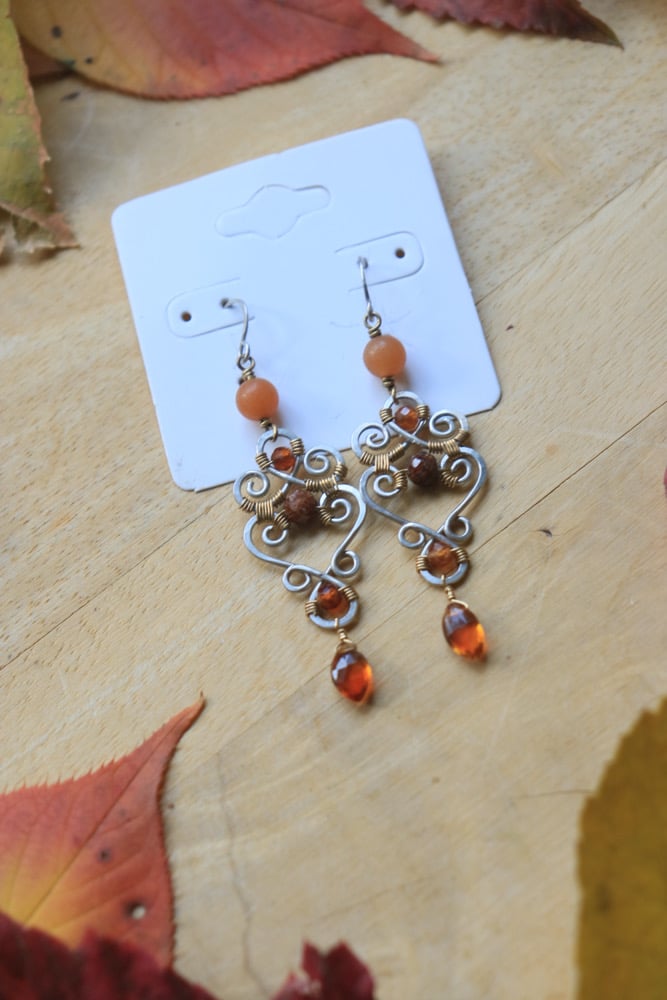 These are fully handmade sterling silver and brass made earrings. The main frames used in this earring are made with sterling silver wire, but woven together using brass wire. The beads woven in the actual frames are orange garnet; the oval teardrop dangling from the bottom is citrine; and the bead used in the top is orange aventurine. The orange tones in this earring was inspired by the fall leaves.
