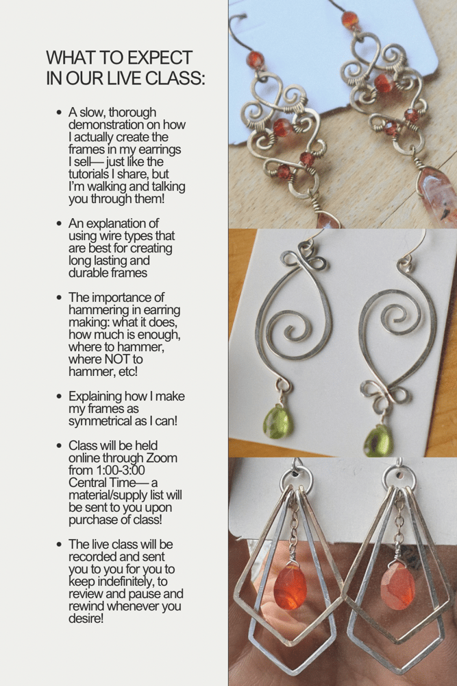 If you’re looking to make your own earring frames to enhance your jewelry making skills, then this might be the class for you to learn how to do that! As a jewelry maker of over four years now, I’ve been holding classes teaching those who are interested in wanting to learn from the skills I’ve developed in the hours I have put into my craft! Many people have been asking me how I make my frames for my earrings, so I put together a frame making class where I’m going to guide you step by step how the magic is done. Please note that I am *NOT* showing you how to make the entire earring (like weaving all the beads in the frame, connecting the the whole piece together, attaching the chains and beads)— I simply will be showing you how I make my frames themselves in the earrings. Two hours would not be enough time to make all three of these designs slow enough for you to all follow along, and my understanding is that people are more interested in the actual frames themselves so they can create their own pieces with it.