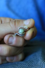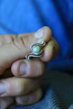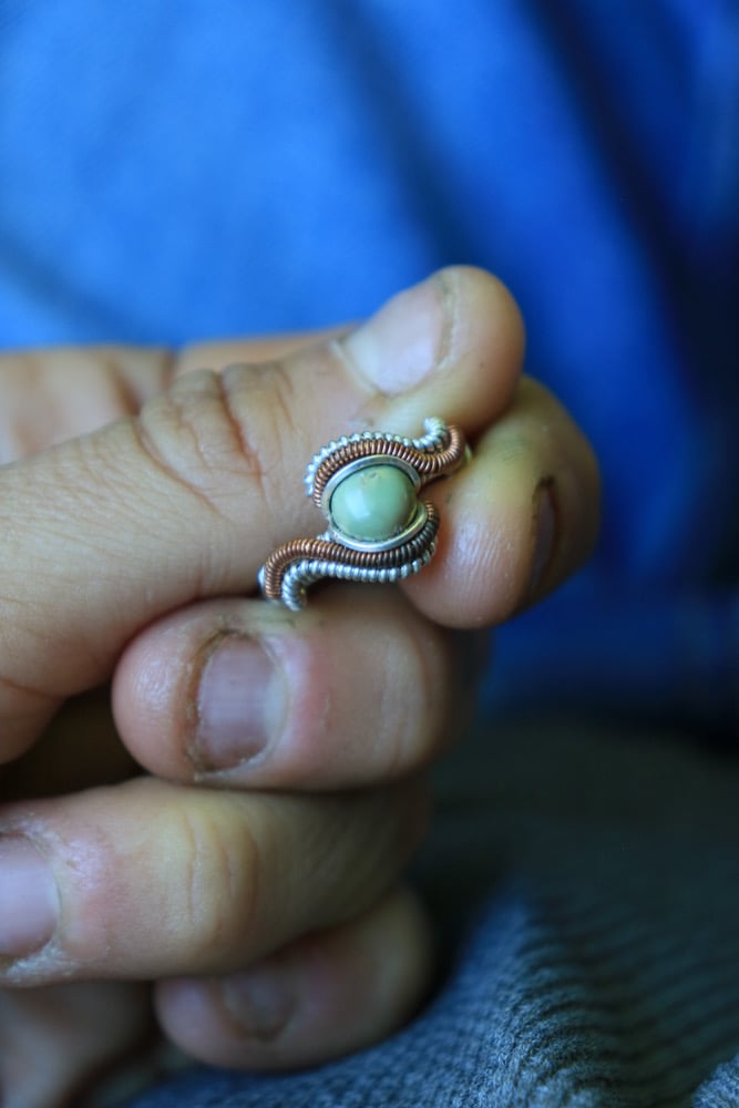 This is a fully handmade sterling silver and copper ring, made with an intricate pattern securing a central green turquoise crystal! The entire band is made of Sterling silver, the only place I used copper is on the top design. Note that this ring measures to be a size 6.5 and cannot be adjusted — this is the size itself.
